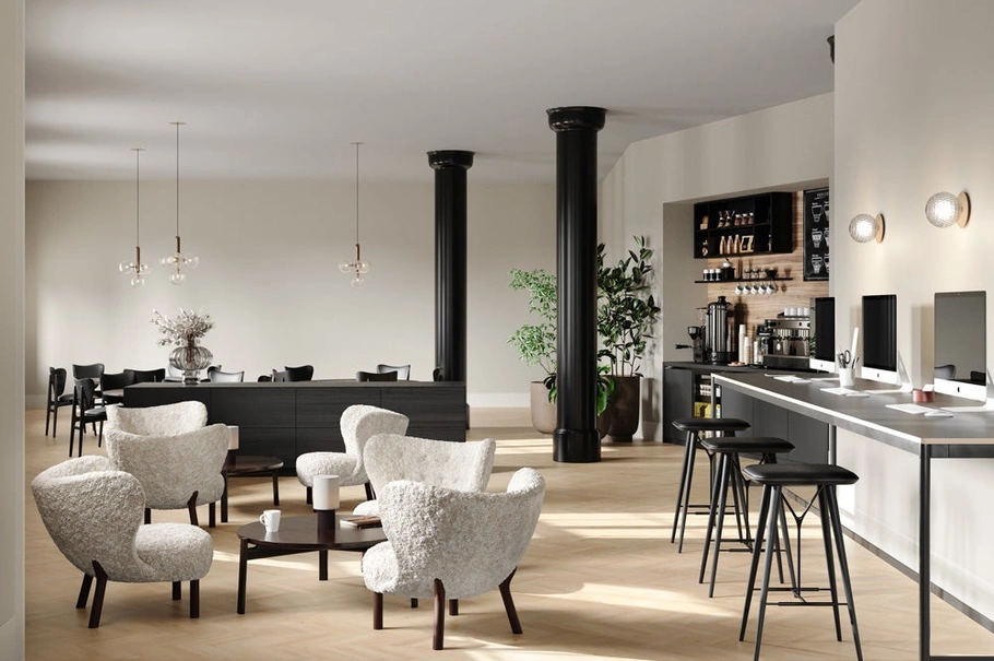 - Højt til loftet, blanke søjler, palæruder og tæt ved caféer og restauranter