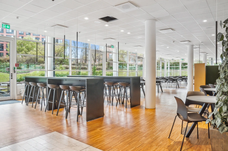 Ejendommen tilbyder en stor frokostbuffet, fitnesscenter, café, bemandet reception samt auditorium, der kan tilvælges som service og betales udover lejen.