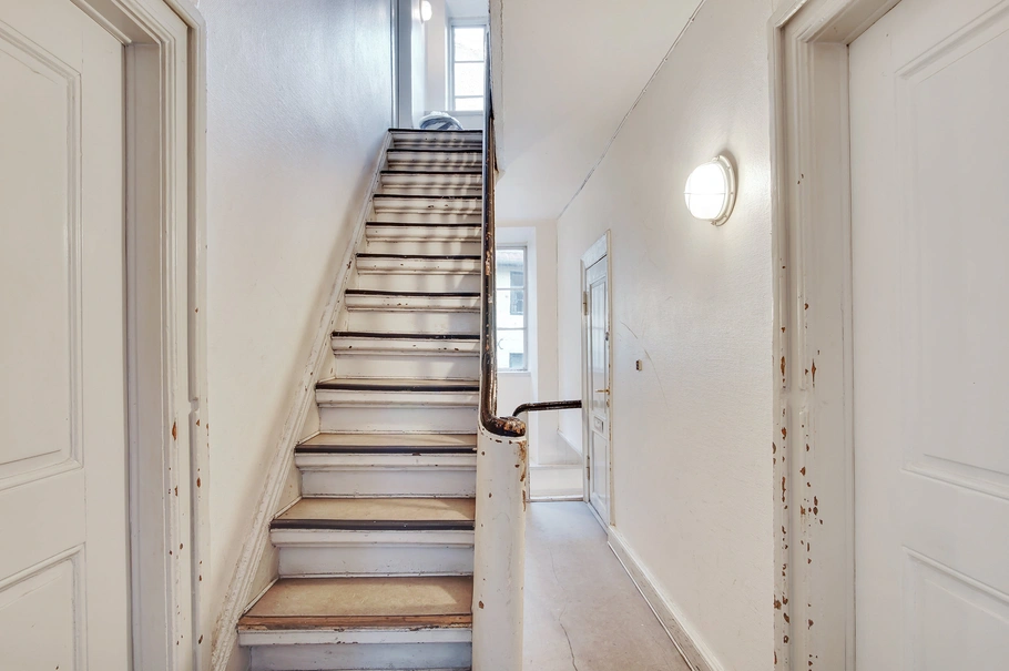 Adgang via forhusets snoede hovedtrappe op til 4. sal. Lejemålet består af ét åbent aflangt lokale, som man træder direkte ind i fra trappeopgangen. Desuden har lejemålet eget tekøkken og badeværelse med toilet, håndvask og bruseniche.