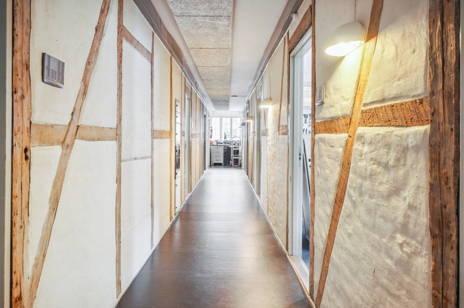 Lejemålet består af flere mindre kontorer, som også kan benyttes til mødefaciliteter. Det klare naturlige lys og atmosfæren skaber en følelse af rummelighed og åbenhed. De høje vinduer giver lys og et livligt billede på trægulvet, som gør gangen til mere end blot et transportmiddel. Entréen byder på bindingsværk, nyt og gammelt, som skaber en stemningsfyldt kontrast. Kontorlejemålet er desuden udstyret med elevator, tekøkken, disponible rum og toiletfaciliteter.