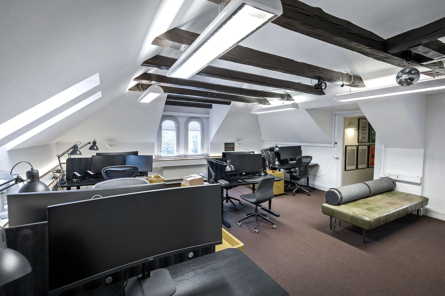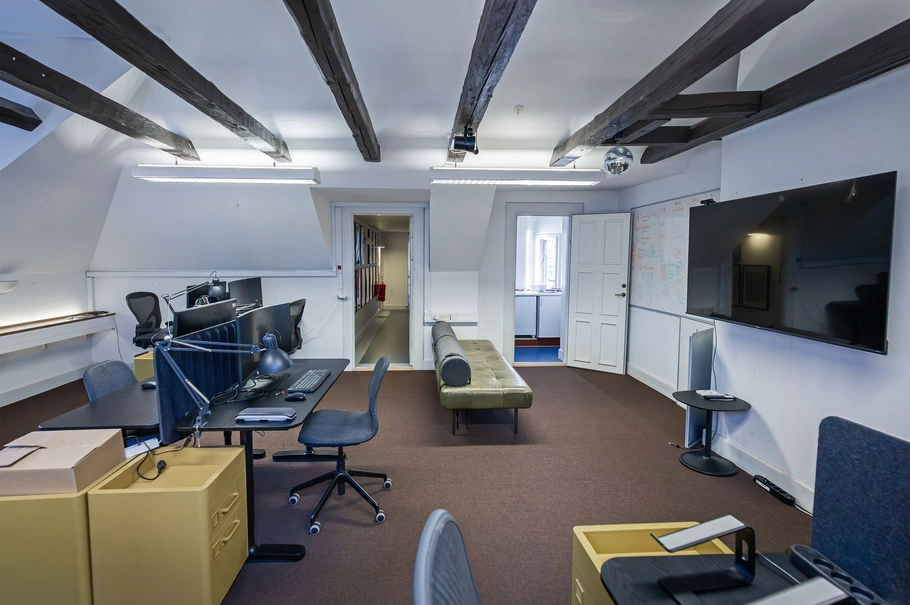 Indretning og faciliteter:Lokalerne er perfekt disponeret med to rummelige storrumskontorer, som ligger side om side. Det ene kontor inkluderer et funktionelt møderum, mens det andet er udstyret med et praktisk lille tekøkken. Der er et godt lysindfald fra vinduerne, der skaber en behagelig arbejdsatmosfære.