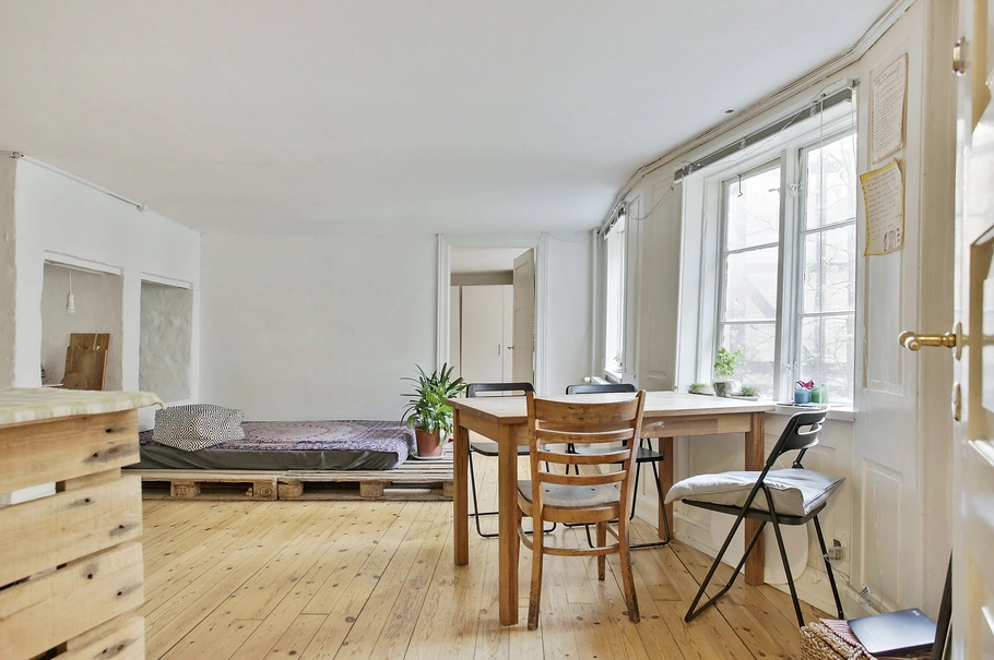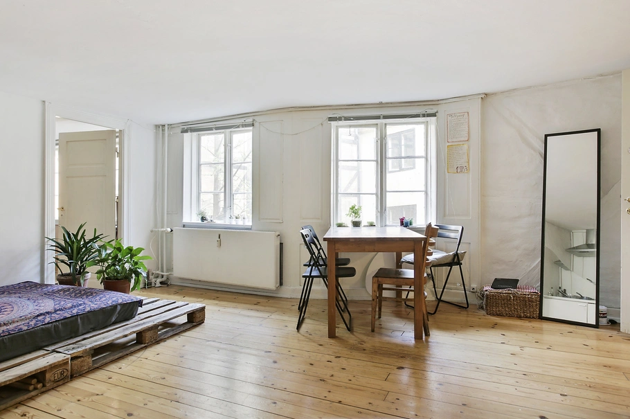Plankegulv, hvide vægge og lofter, lyst træværk. Åbent ildsted anvendes i dag til reol/opbevaring. Meget charmerende omgivelser, og helt fredeligt, trods beliggenheden midt i centrum.