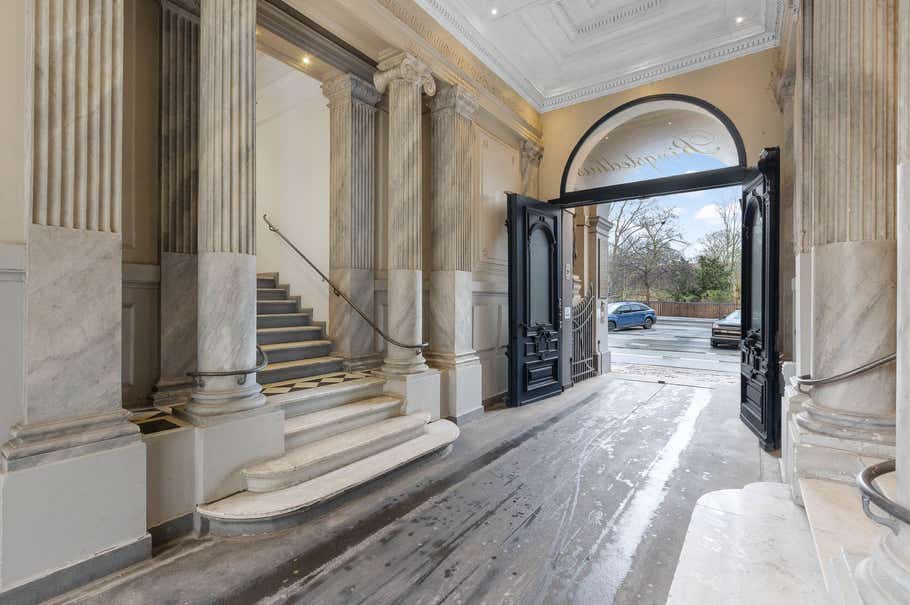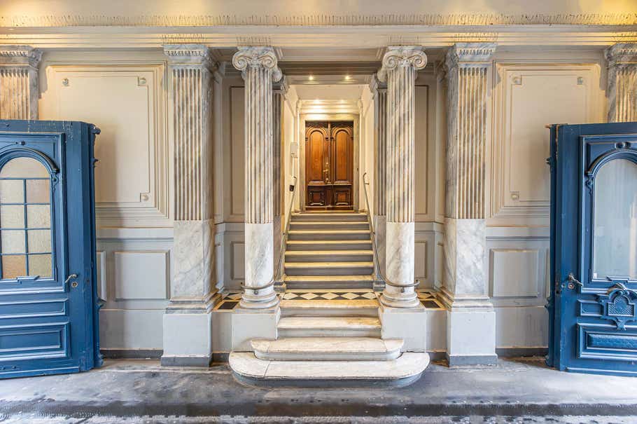 Ankomst til lejemålet sker via smukt portrum med flotte marmorsøjler. Herfra har lejemålet egen privat indgang via bred trappe og en flot massiv hoveddør med smukke udskæringer.