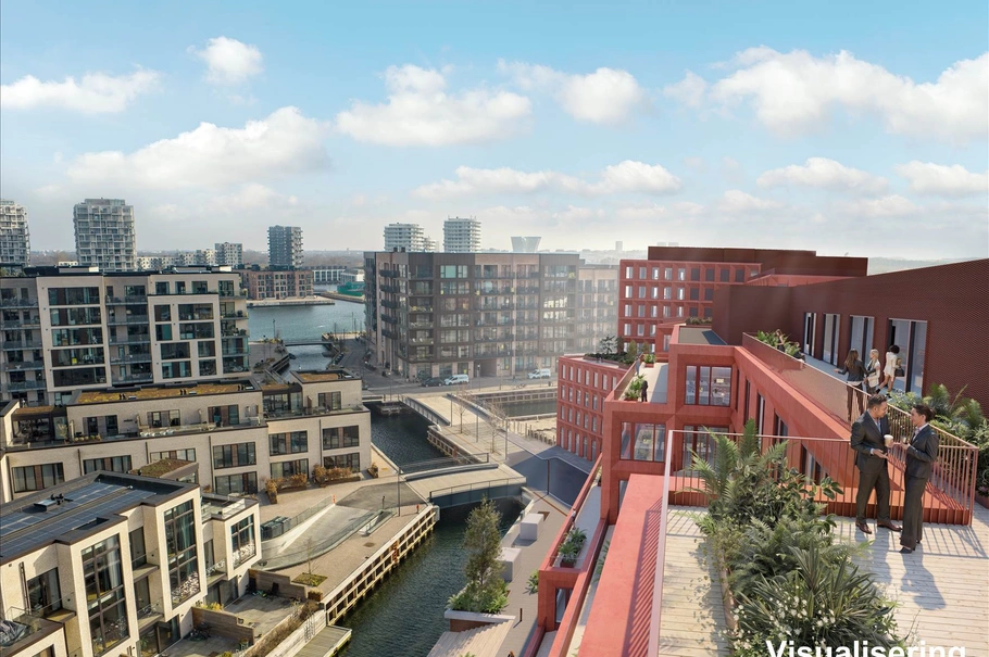 • The Warehouse - fleksibelt flerbrugerhus eller domicil med grønne tagterrasser placeret i Engholmene: Københavns nye kanalby, hvor erhverv, boliger og byrum forenes i en maritim stemning.