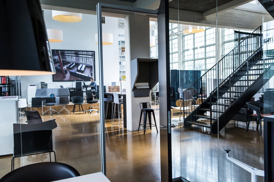 - Åbent kontormiljø med dobbelt loftshøjde på 7,4 meter og mødelokale på indskudt dæk