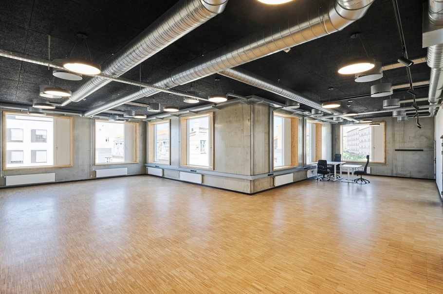Alle etagerne er indrettet med store åbne kontorlandskaber samt enkelte kontorer og mødelokaler. Der er tekøkkener og flere toiletter på hver etage, hvilket gør pladsudnyttelsen optimal og skaber rum til mange arbejdspladser. Med en loftshøjde på 3,5 meter og rå betonvægge fremstår lejemålet med en industriel og rå æstetik. Ejendommen har desuden et optimalt indeklima med både ventilation og køling.