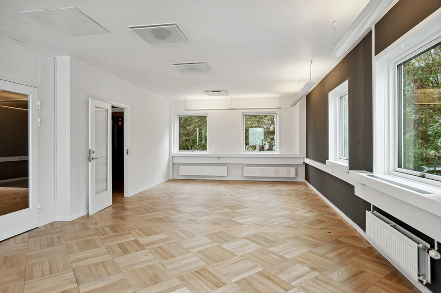 Lejemålet tilbyder et samlet areal på 164 m². Det rummelige layout og de store vinduespartier sikrer et naturligt lysindfald, der skaber et inspirerende arbejdsmiljø. Her får du også et åbent køkken med kogeø og opholdsområde – ideelt til både arbejde og pauser.