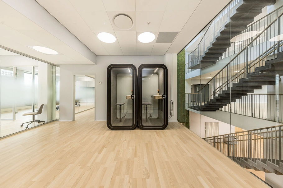 Ejendommen er i syv etager, og alle kontoretager fremstår indflytningsklare med flotte, lyse trægulve, mødelokaler i glas og med nyistandsatte tekøkkener og toiletter. Tekøkkenerne er snedkerlavede i træ med stålbordplade, og toiletterne fremstår moderne med flotte, grønne nuancer.
