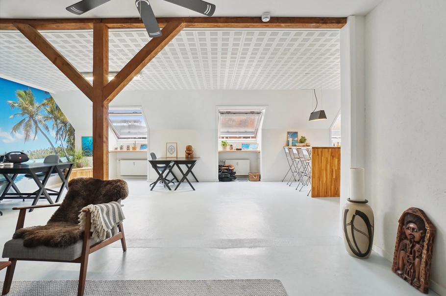 Køkken/alrum og dele af det åbne kontor er beklædt med akustikplader i loftet for at give lejemålet en god akustik. De lyse og ensartede gulve er med til at skabe et lyst og venlig arbejdsmiljø og passer godt ind i den øvrige indretning og i samspil med det nyere køkken. Lejemålet fremstår generelt pænt, velholdt og indflytningsklart. Der er adgang til et fælles gårdmiljø med muligheder for at leje P pladser.