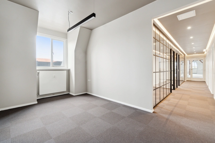 Lejemålet trænger generelt til at blive nyistandsat – og er p.t. er udstyret med gulvtæppe, fritstående træbjælker og masser af naturligt lys. Atmosfæren i lejemålets lokaler oser af behagelig og naturlig elegance. Lyset skaber en beroligende arbejdsplads, mens gulvtæppet tilføjer varme og komfort. De fritstående træbjælker giver et strejf af karakter og skaber en jordnær følelse, der kan inspirere til kreativitet og fokus.
