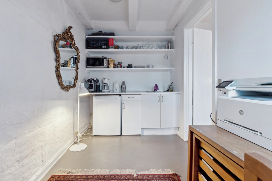 Planløsningen er effektiv, hvor du træder direkte ind i et storrum der kan anvendes til kontor eller til kreativt space. Herfra er der adgang til Køkken med spiseplads, som er placeret i den ene ende af lejemålet. Lejemålets har fælles toilet placeret udenfor lejemålet, hvilket deles med underboen som er en advokat. Nuværende lejer oplyser at dette fungerer upåklageligt.