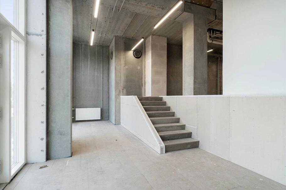 Enheden er på 143 m² og er indrettet med et pænt toilet, og et stort åbent rum i 2 niveauer. Lille kontor herudover. Skønt rum med høje vinduer og masser af lys.