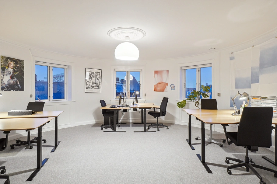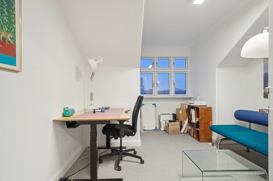 Lejemålet er et attraktivt kontor på 5. sal, der spænder over 214 m² og byder på en fantastisk udsigt over byens tage. Der medfølger et unikt 43 m² tårnspir, som ligger to etager over og kan anvendes til lager eller arkiv.