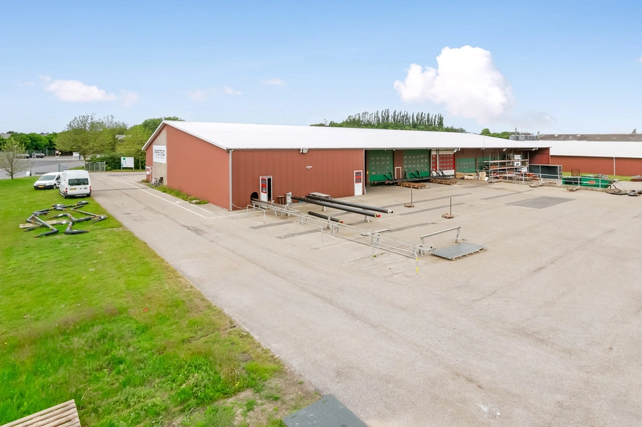 Isoleret stålprofilhal på ca. 1.200 m² med støbt gulv. Hallen har en frihøjde i siden på ca. 4 meter og ca. 6,5 meter til kip, og er velforsynet med aluhejseporte. I hallen er indrettet et mindre lager/produktionslokale. Herudover findes kontor, teknikrum/depot, samt toiletter og mulighed for bad. Lejemålet opvarmes med kaloriferevarme. På den ene side af bygningen findes et overdækket læsseareal på ca. 150 m², samt læsserampe.