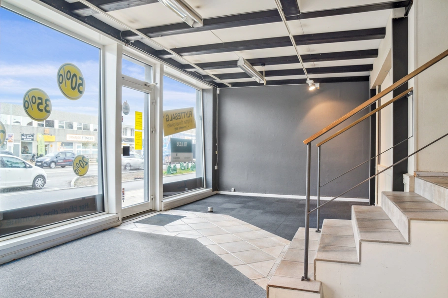 Salgsarealet i stueetagen er niveaudelt, hvori den forreste del er i gadeplan. Det resterende salgsareal tilgås via to mindre trapper i hver sin side af lejemålet.