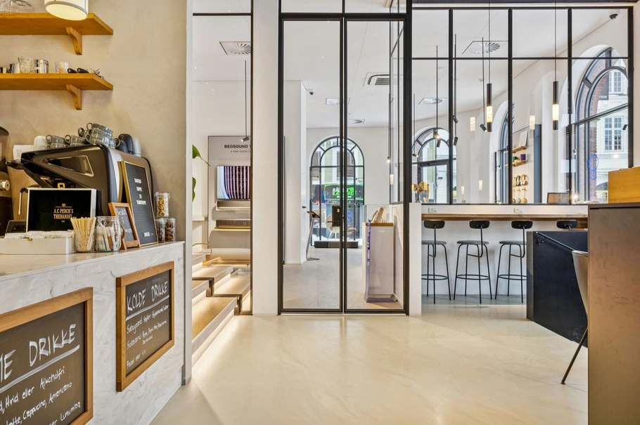Lokalerne er velindrettede med en optimal balance mellem køkken, serveringsområde og personaleplads, og de høje vinduer mod pladsen inviterer det livlige byrum indenfor.
