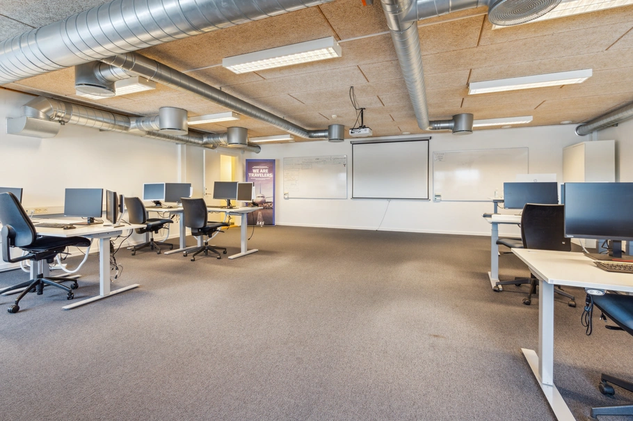 Fra entreen er der adgang via trappe til lejemålets 1. sal som primært er åbent kontorlandskab, men med syv særskilte møderum/kontorer. Det ene af rummene har en størrelse, der med fordel kan anvendes som udvidet kantine, mødecenter eller personalerum.