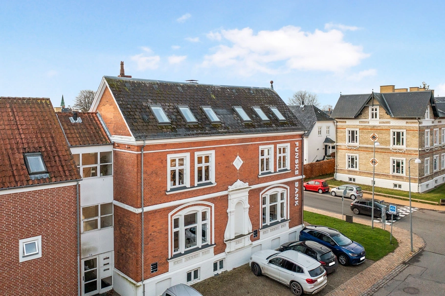 Ejendommen fremstår som en karakterfuld hjørneejendom med flotte detaljer, herskabelige vinduespartier og et markant kuppeltårn, der giver en synlig og repræsentativ profil. En oplagt ramme for virksomheden, der ønsker eksponering og identitet.
