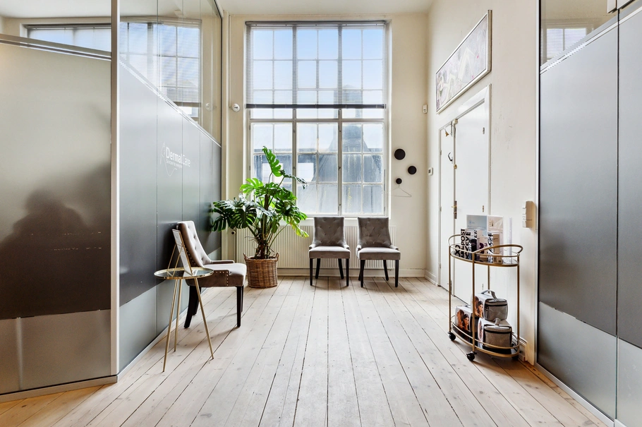 Atmosfæren i lejemålet er varm og indbydende, og egner sig til den kræsne lejer der ønsker et rummeligt arbejdsmiljø med højt til loftet.