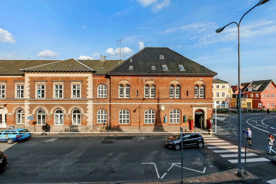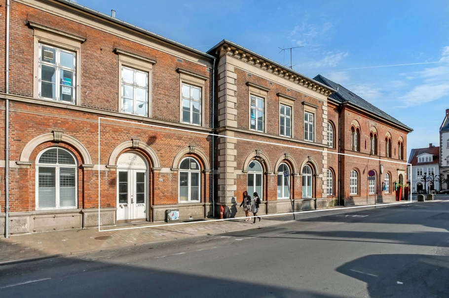 Ejendommen har en fremtrædende facade mod Klosterplads og en attraktiv placering tæt på både byens gågader og havneområdet.