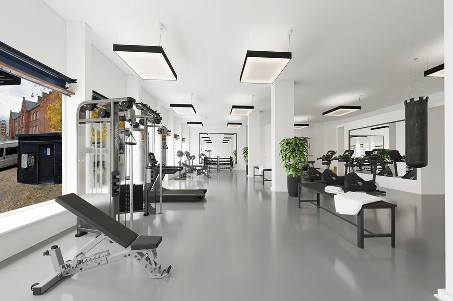 Lejemålet indeholder i stueplan et stort regulært areal med en mindre kontorsektion i den ene ende. I stuen findes yderligere et par toiletter. Lejemålet har glaspartier fra gulv til loft i hele facaden samt på bagsiden hvilket giver en skønt og naturligt lysindfald. I kælderen, parterreniveau, findes køkken / kantine samt port i niveau. Herfra er der adgang til lager og omklædningsfaciliteter med bade og toiletfaciliteter.