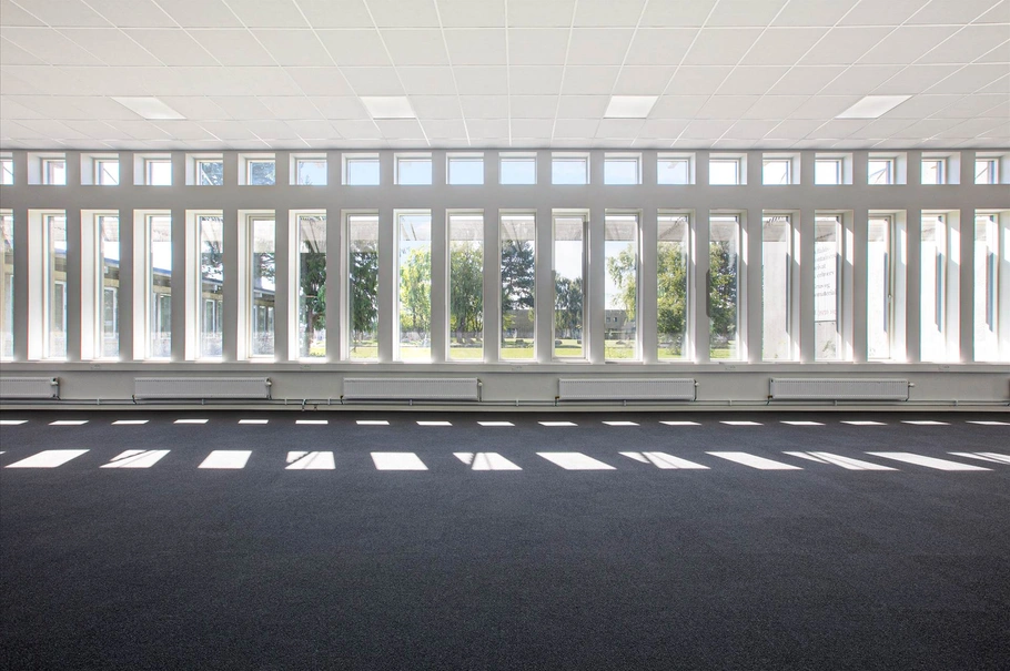 Bygningen har et unikt design, idet en del af bygningen har en ekstra loftshøjde, hvor der er etableret et 360 graders vinduesbånd langs loftet, hvilket giver en fantastisk rum- og lyseffekt.