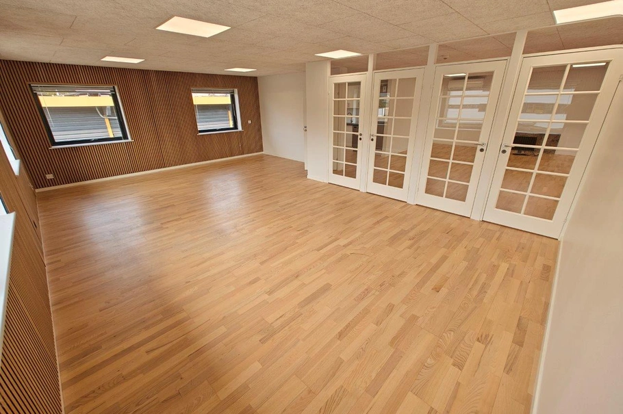• Lejemålet udgør ca. 135 m2, med et stort åbent kontorareal, mødelokale, frokoststue med køkken, og eget toiletrum, alt lyst og moderne.