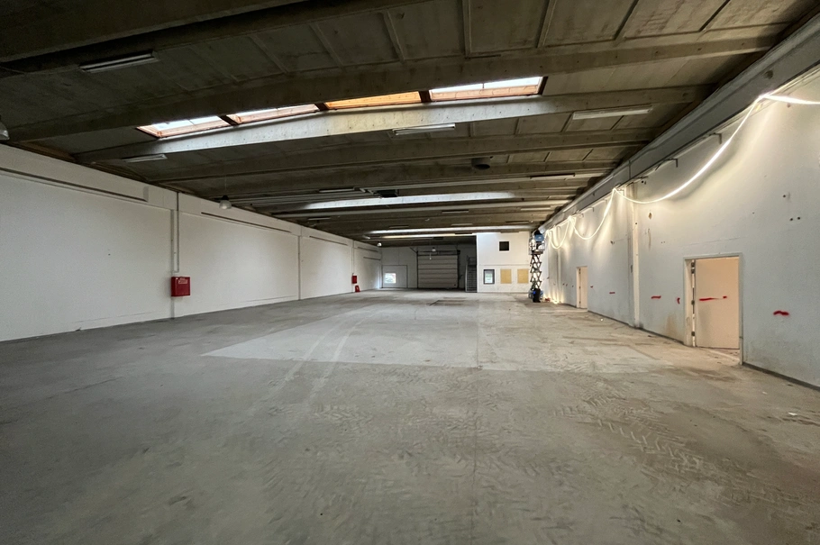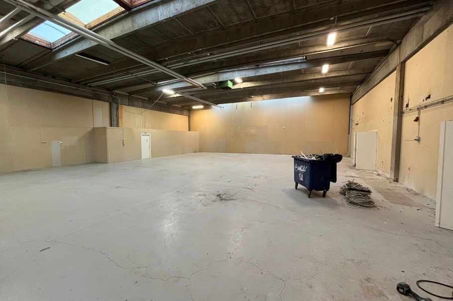 Stort og højloftet lagerlokale med tilhørende kontorlokale.