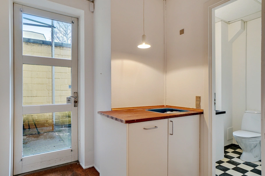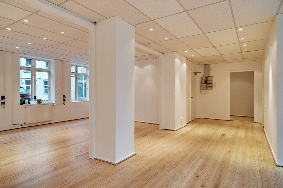 Lejemålet er velindrettet med mødelokale bagerst i lejemålet med et stort vindue ud til gårdhaven. De åbne kontorpladser som er placeret i umiddelbart ved indgangen giver en effektiv udnyttelse af m2 i lejemålet, den smalle bygning som er to sides belyst giver et rigtigt lysindfald i kontoret, herudover er der mindre køkken samt toilet.