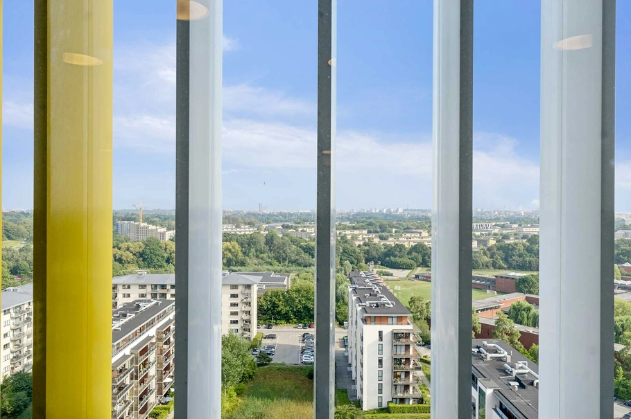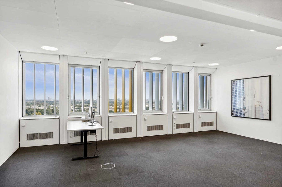 Lejemålet er beliggende på 13. sal, hvor hele seks elevatorer fører op direkte til lejemålet. Fra lejemålet har du skøn udsigt over Storkøbenhavn, og på en klar dag kan man se Øresundsbroen i det fjerne.