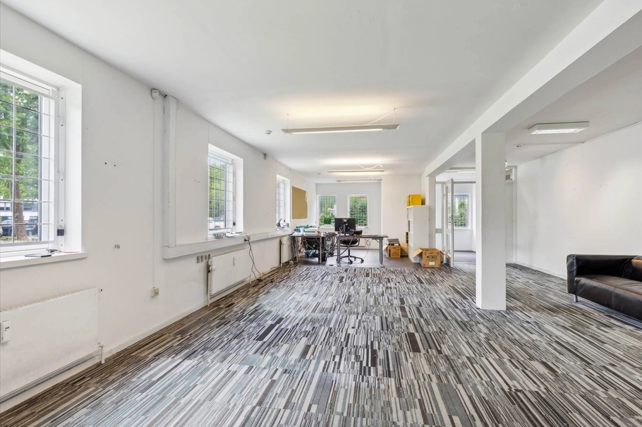 Kontordelen er indrettet med storrumskontor, køkken med spiseplads, 2 toiletter og depotrum. Direkte adgang til lageret, der er et stort reelt rum med ca. 4,0-4,5 meter til loft. Adgang til lageret via dobbeltdør samt port i terrænniveau. Loftsrummet er et stort rum, der kan anvendes til opbevaring. Loftsrummet har en højde på ca. 1.8 meter.
