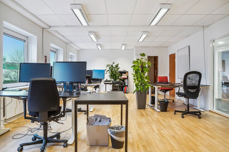 Kontoret er beliggende på 1. sal i en 3-etagers rødstensejendom.