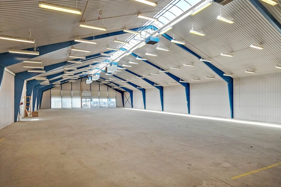 Lageret er en stor søjlefri hal med glasfacade med dobbeltdør i den ene ende og stor port i den anden ende.