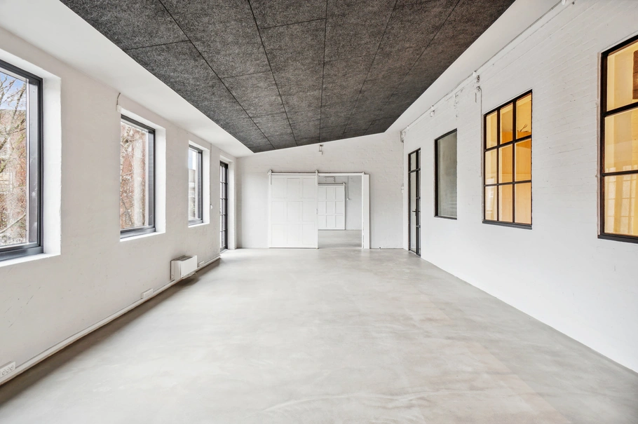 Gulvbelægningen er pudset beton og loftsplader af sort troldtekt.