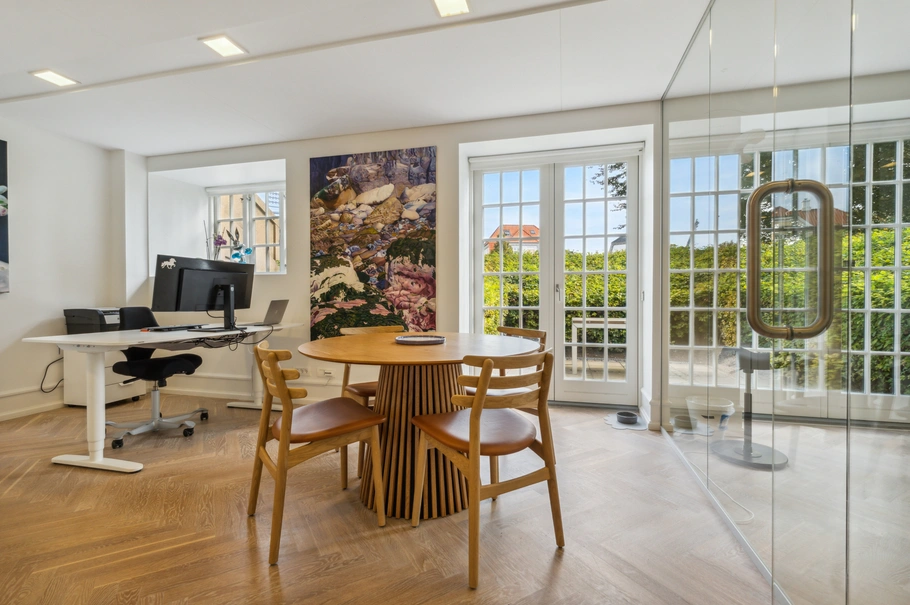 Lejemålet på Nordvestvej 31, st.th., er en del af en totalrenoveret kontorejendom, der kombinerer moderne funktionalitet med respekt for ejendommens oprindelige arkitektur. Renoveringen er udført med fokus på kvalitet og eksklusive detaljer, hvilket blandt andet ses i de smukke sildebensparketgulve og den elegante belysning, der tilsammen skaber et stilfuldt og indbydende arbejdsmiljø. Ejendommen fremstår som en præsentabel og professionel base for virksomheder, der ønsker en kombination af æstetik og funktionalitet.