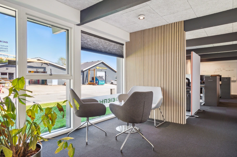 Lofterne er lavet i troldtekt og der er etableret flere trælamelspaneler, der sammen sikrer en rigtig god akustik på alle arbejdspladser.