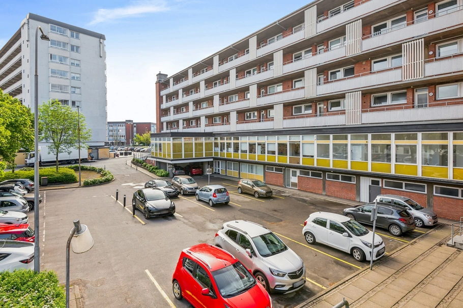 Lejemålet kan både tilgås fra ejendommens hovedindgang samt baggårdsmiljø, hvor kommende lejer vil få 4 stk. parkeringslicens til parkeringsarealet (fællesparkering i Skrågade, og parkering er efter først til mølleprincippet. P-licensen er inkluderet i lejen, og dermed gratis.)