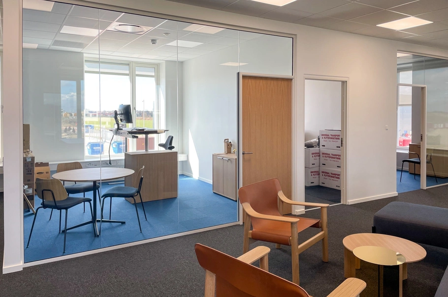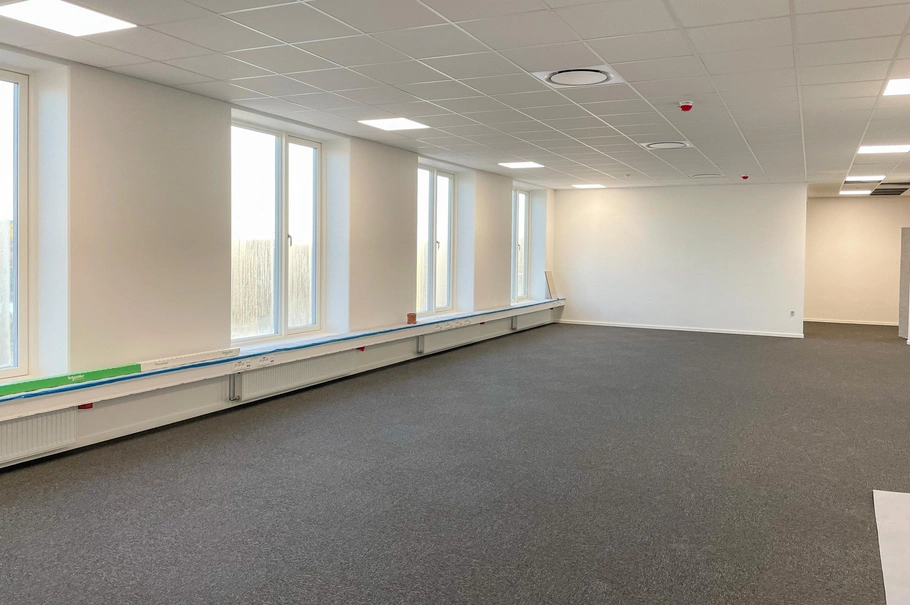 Gulvene er belagt med tæppefliser og lofterne er udført som nedhængte akustiklofter med integreret ventilation og belysning.