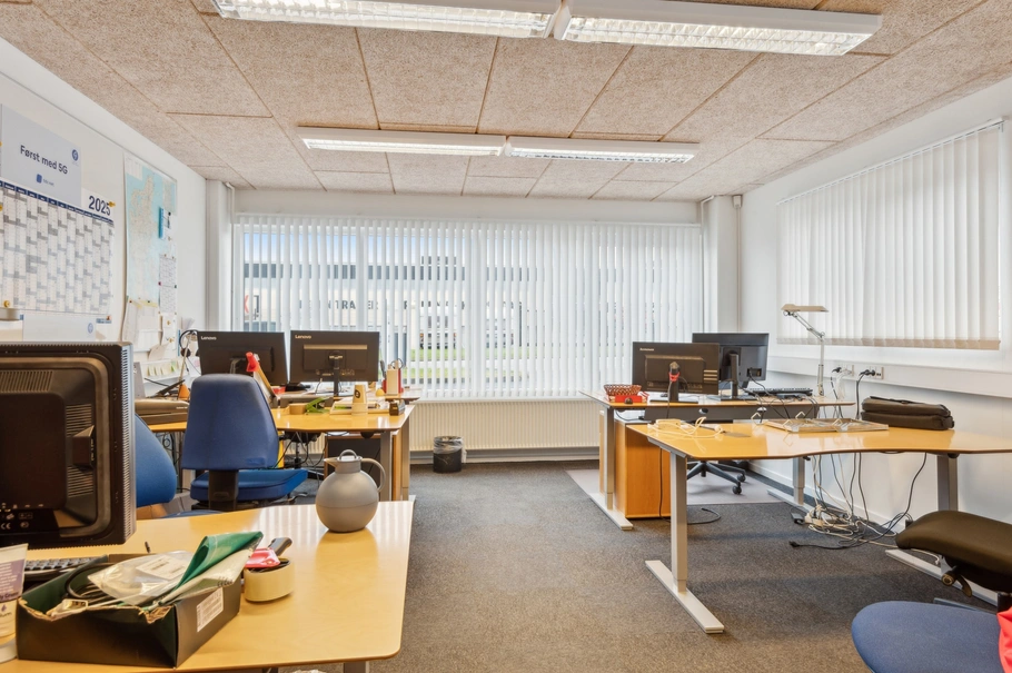 Lejemålet er velindrettet med fin administrationsafdeling som består af víndfang, 2 store kontorlokaler, stort mødelokale/åbent kontorlandskab, mødelokale, personaleafdeling med køkken samt omklædningsafdeling med toiletter og bad. Desuden er der udgang til lyst regulært lager som har port adgang, samt stort lyst kontor.