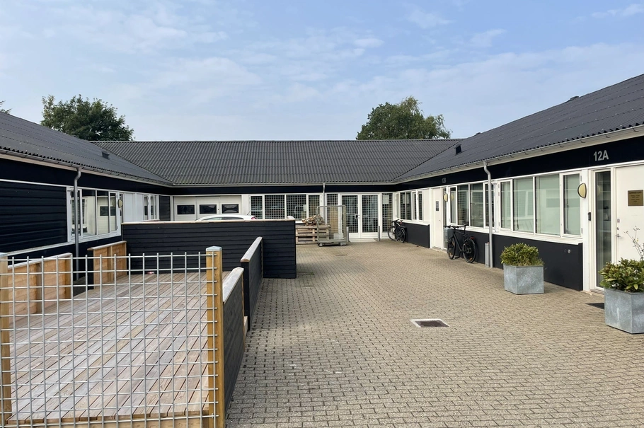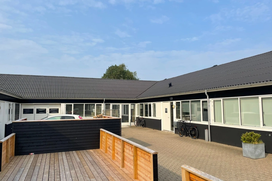 Kontorafsnittet består af vindfang, stort åbent kontorlandskab, samt 2 stk. cellekontorer, mødelokale, the-køkken og toilet med bruser.