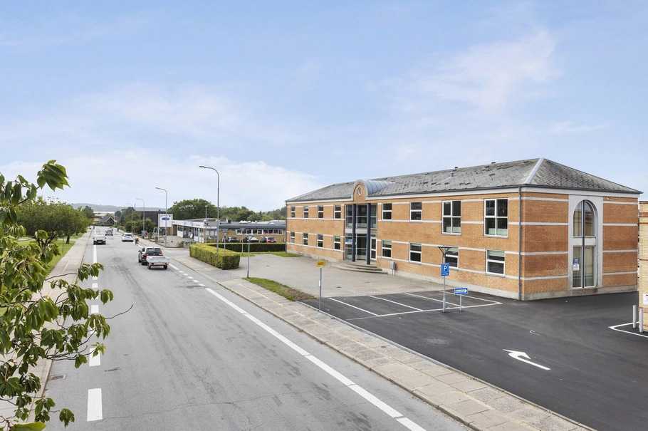 Der er kundeparkeringsplads foran ejendommen - og stor personale parkeringsplads og cykelskur på bagsiden af ejendommen.
