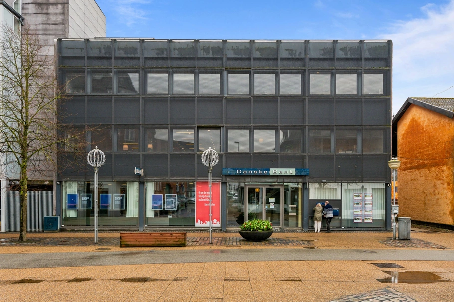 Lejemålet, som gennem en lang årrække har været udlejet til Danske Bank, er i stueplan indrettet med stor lyst og regulært butikslokale, som er forsynet med niveaufri indgangsparti og store udstillings-vinduer.