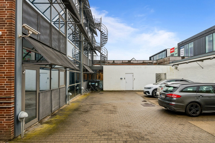 I baggården er der parkeringspladser som kan medfølge efter aftale. Desuden er er gode muligheder for parkering på ejendommen, ligesom der er kort afstand til parkeringskælderen i Metropol. Desuden er der kort afstand til de offentlige parkeringspladser på Vendelbopladsen samt Mammut-pladsen.