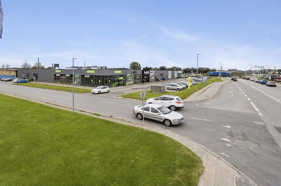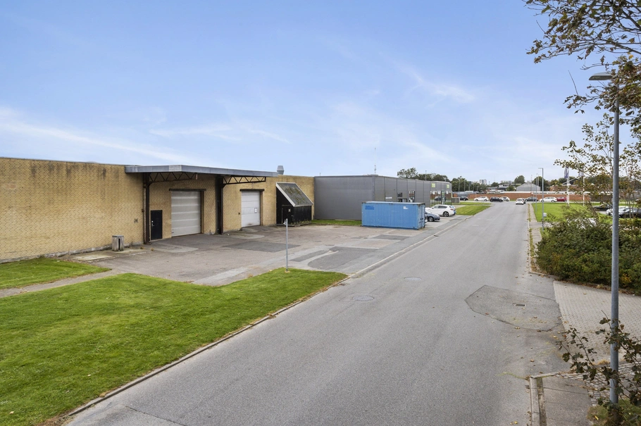 Bygningen har en murstensfacade, og området udenfor inkluderer parkeringsmuligheder samt en asfalteret vej. Lokalet er placeret i et erhvervsområde med adgang til vejnettet, hvilket gør det velegnet til logistik og varehåndtering.