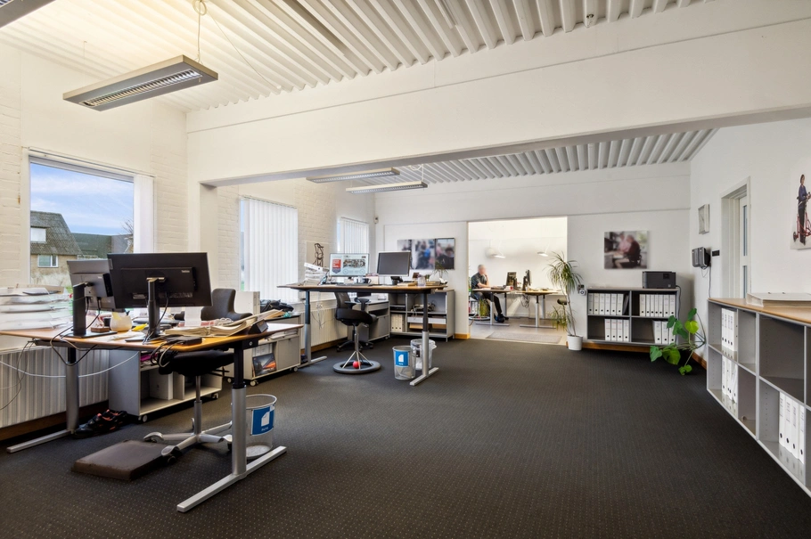 Produktions-/lagerdelen er velindrettet med regulært produktionslokale, som har en god krandækning og en loftshøjde på ca. 5 - 6 meter. Desuden er der højloftet værkstedsafdeling med traverskran, værkførerkontor og velfærdsområde med omklædning, toilet og badefaciliteter. Produktionslokalerne har gode adgangsforhold via 2 aluporte og lokalerne har bl.a. punktudsugning og et stort lysindfald fra mange ovenlysvinduer.