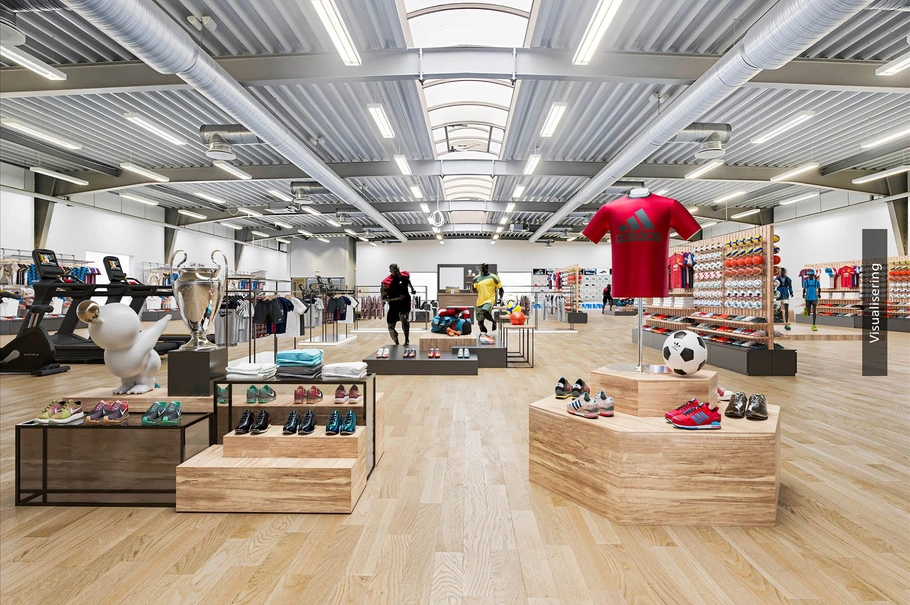 Lejemålet er indrettet med et stort salgsareal på ca. 1.000 m² med højt til loftet, hvilket giver mange indretningsmuligheder. Lejemålet er udstyret med loftsbelysning, ventilation- og klimaanlæg for at sikre et optimalt indeklima. Lager og personalefacilitere udgør samlet ca. 300 m², hvor der til