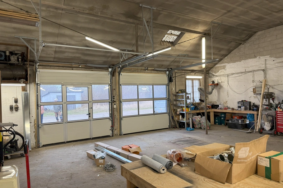 - Værkstedsrum med vinduer og 2 nye porte. Den ene er elektrisk