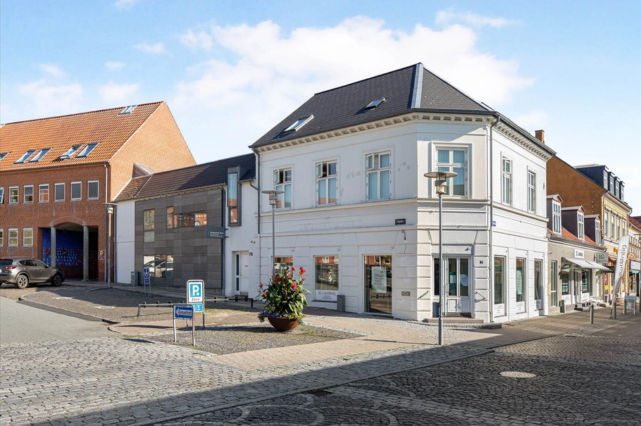 Lejemålet er tidligere bank som nu er klar til nye lejere. Der er 425 m² i stueplan. Lokalerne ligger både med vinduer mod Torvet og mod Østergade. Indgangspartiet ligger på hjørnet af Torvet og Østergade, her kommer man ind i det tidligere kundeområde i banken. Her er også spindeltrappen ned til de 83 m² kælder, der er opdelt i 2 rum. Der er ud over det store åbne lokale et par kontorer/mødelokaler. Bagerst i lejemålet har vi køkkenfaciliteter med spiseplads samt toilet faciliteter, depot mm. Det store åbne lokale har en mindre niveau forskel fra området mod Østergade og den del der vender mod Torvet og gården.