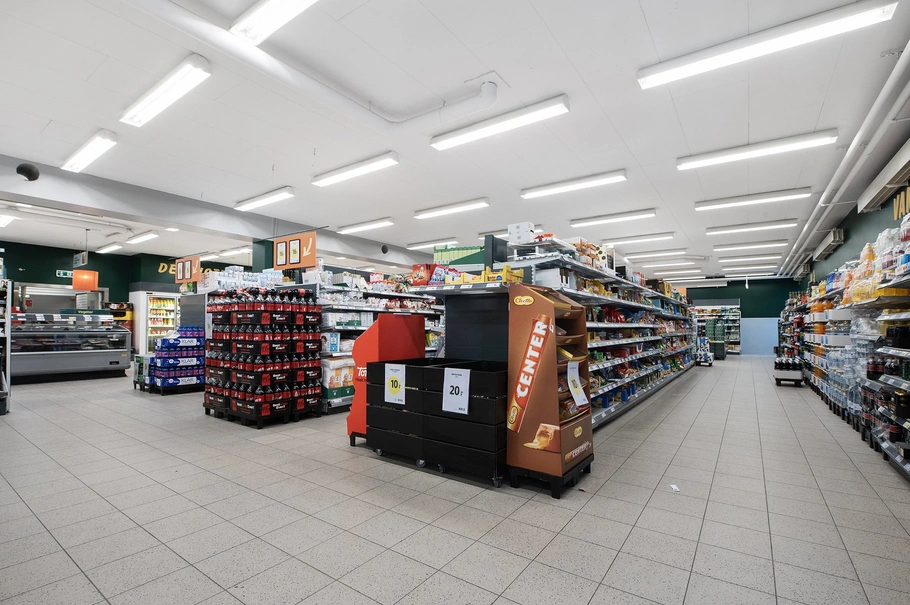 Butikken er pæn og velholdt, og de 828 kvadratmeter fordeler sig over en god, praktisk planløsning. Der venter et stort og regulært butikslokale med mange indretningsmuligheder, et baglokale med lager, køle- og fryserum, kontor, toilet og personalerum med køkken, og derudover er der selvfølgelig en varegård.