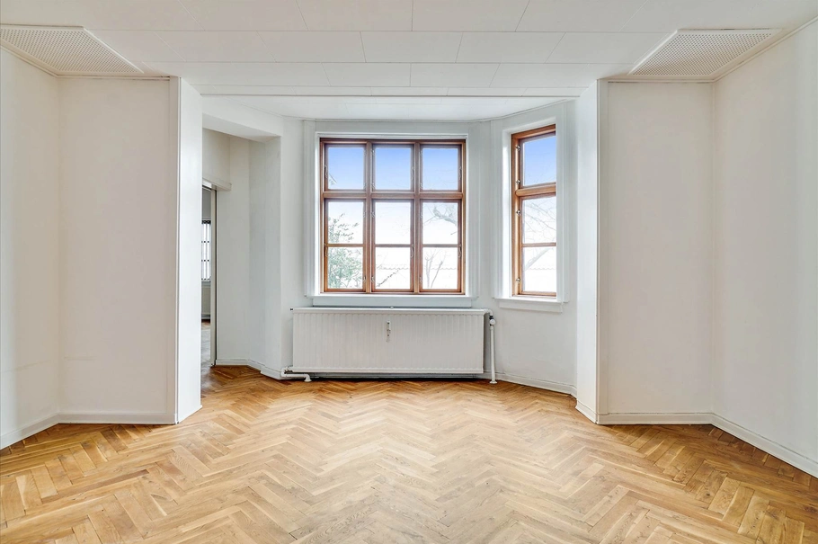 Herfra adgang til venstre side af lejemålet til åbent kontor/reception, herfra adgang til 2 store kontorer vendende mod bagfacaden og hvor det ene kontor har karnap.
